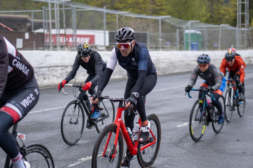 It started to rain as soon as I pulled up to the venue. I don’t like racing in the rain and I especially think that a motorsports speedway, which is covered in oil and other crud is probably the worse place for a bike ride in the rain. I think a lot of people had a similar thought as only 10 people showed up to race B’s. With the small field numbers, I thought that it would be possible to get a break with a couple of guys and lap the field since not many people would be motivated to chase.