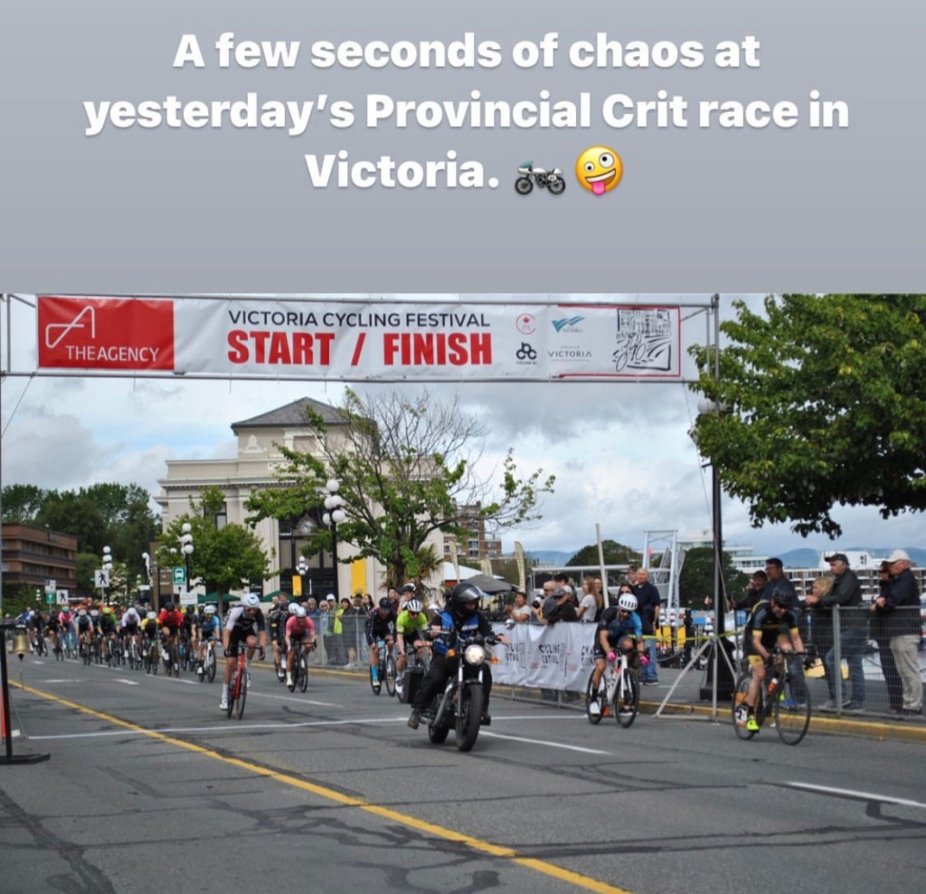 The next incident came closer to the end of the race when a triple shot ride (Joji) didn’t quite make the 3rd corner, he hit the curb and was catapulted into the grass. The speed was high at this point and I was a little caught out, but two laps later I found myself in a three-man breakaway. We came out of the final corner to find the commissaire motorcycle stopped at the finish line. As the 3rd wheel in the three-man break as the two guys moved slightly left I raised my head only to have my first glimpse of the back of the motorcycle. I panicked and swerved right to avoid it, at the same time the motorcycle took off and swerved right in front of me.