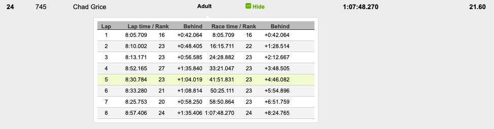 I tried to keep the pace up by just staying smooth and not giving full-out efforts. This gave me eight and a half minute laps, not horrible but not great either. On the last lap, I realized I had made it through and would not get lapped so I took a “victory” lap at an easy pace and made it to the end in one piece.