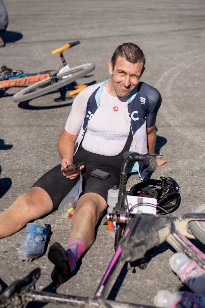The second loop although much shorter has almost the same elevation and it’s all in the first 25km. Shortly after I entered the second loop I saw Brenna again only this time she was walking backwards carrying her bike. She had snapped her derailleur off and was calling it a day. The climb was long and I took it steady the only person I saw on it besides Brenna was Claire Townsand as she pedalled by me. I got to the top of the climb and descended to the last aid station and into the bottom of the final real climb where I caught a rider. Jon Hillier had stopped at the aid station and I had rolled up on him. We went into the final climb together both broken men. We reached the top of the climb and the bottom of the descent together. Through the final single track, my front and rear both suffered small punctures the front lost some air but the back decided it didn’t want to hold air anymore. I was riding fully on cushcore and even like that, I was still able to keep going at a reasonable pace. We worked together on the final trail section and hit the finish straight together. With my flat tyre, I wasn’t able to follow his acceleration and I rolled over the line a few seconds behind him.