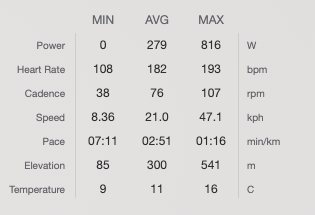 The climb flattens out in the middle and then pitches up again. In that flat section, I was already Isolated but I put my head down and just kept turning the pedals over. In the second half of the climb, I kept the power up and focused on getting to the top and then finding a group to ride with. At the top of the climb, I couldn’t see anyone in front or anyone behind. The numbers are below.