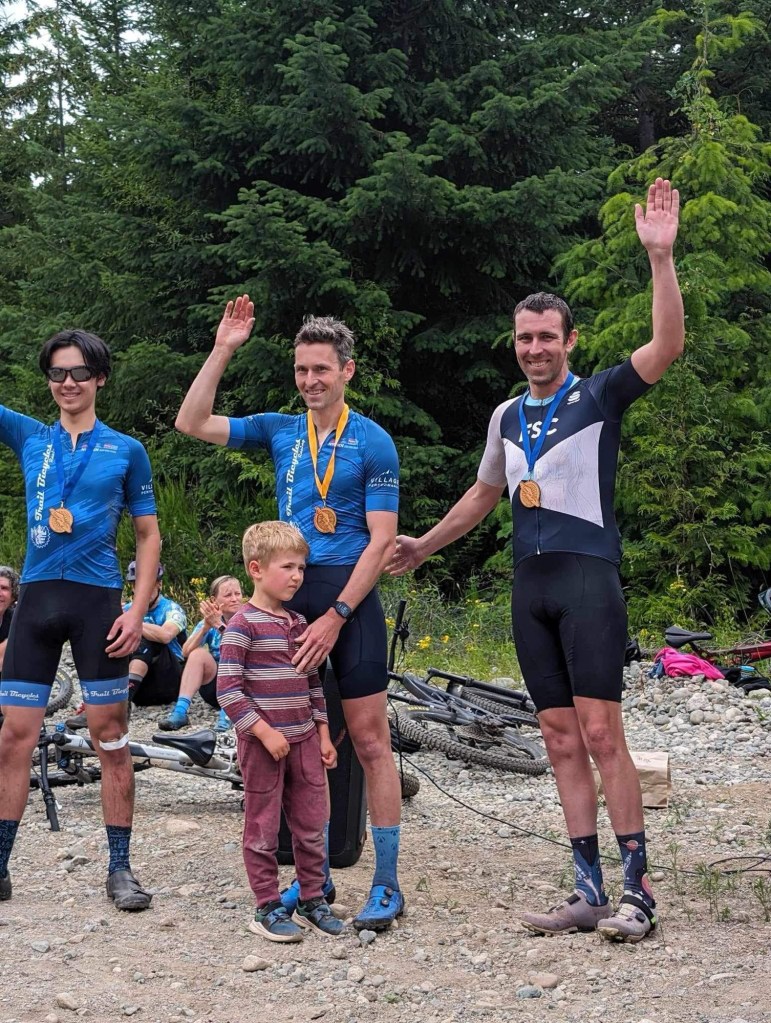 The next two and a half laps remaining, I was alone other than lapping traffic. I really focused on keeping smooth in the downs and saving energy for the climb. And that’s how it went; fairly metronomic from then on. I did look back a lot to see if anyone was gaining on me, and I never did see a competitor from my division behind me after the first lap. When I exited the last single-track section of the last lap and pointed uphill on the fire road, I could see Lindsay off in the distance. We had talked the night before about whether I could lap her or not, and now was my chance. She was definitely taking it easy, as she was also not able to afford a crash and was already secured in her series overall win. I caught her just before the line, and our friends on the sidelines were yelling and cheering quite loudly, which I think confused her for a second, and she stopped pedaling. I gave her a slight shove over the line, and she started her last lap about a wheel length before I finished.