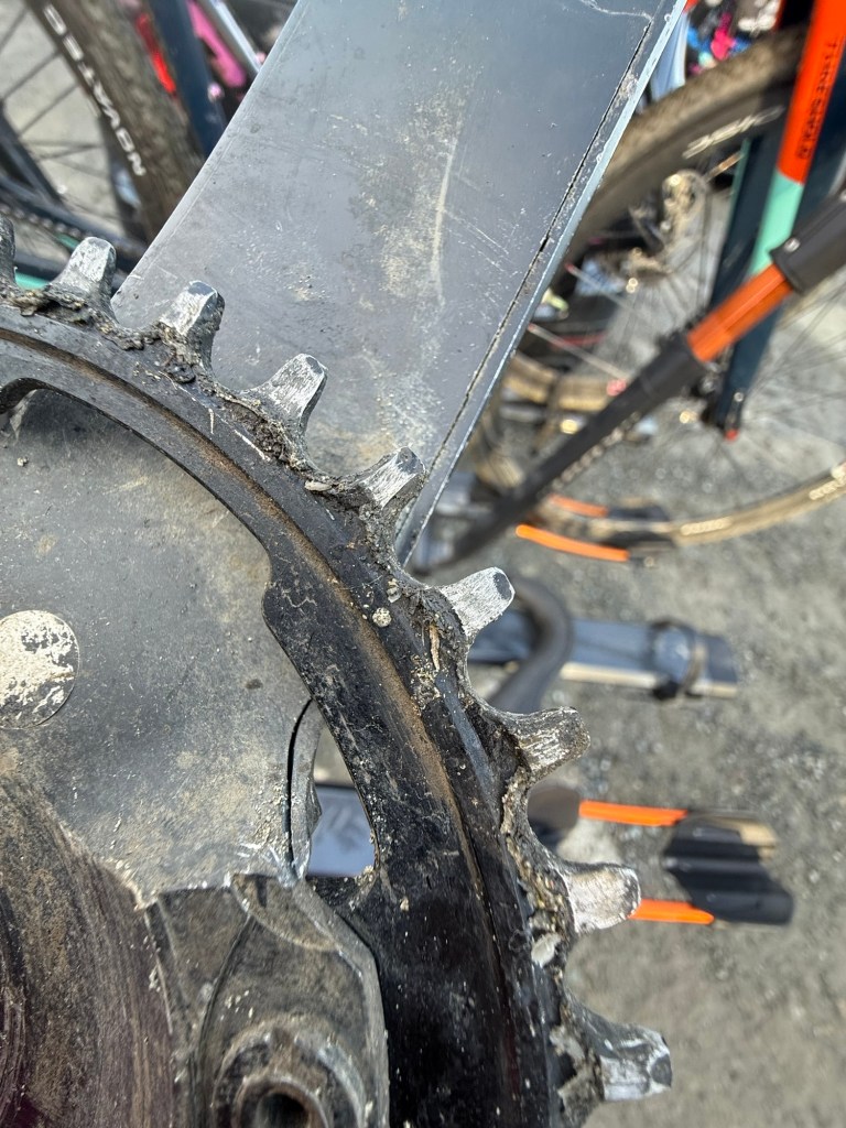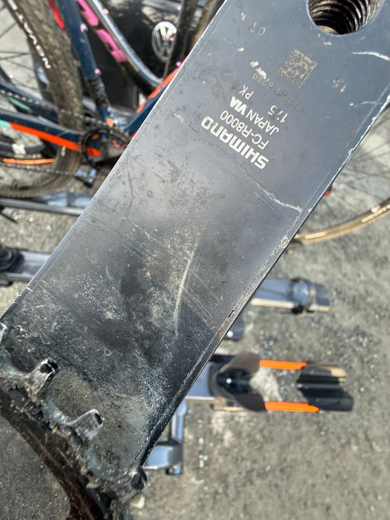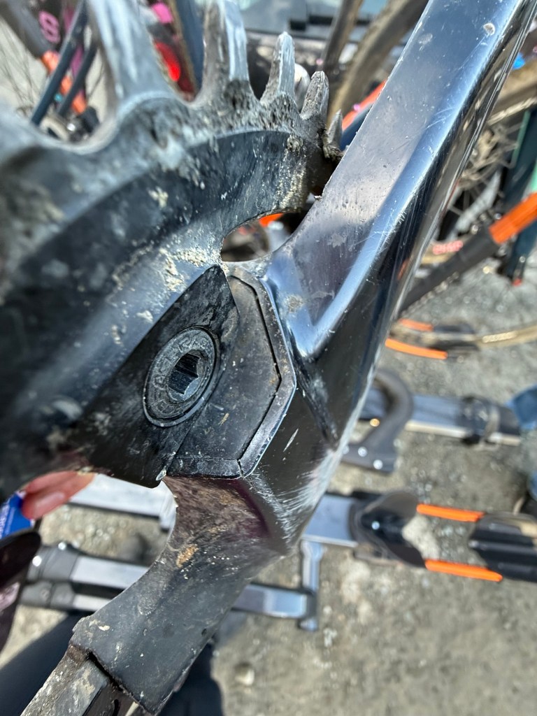 Rain fell overnight and in the morning, which I was looking forward to, hoping it would slow down the race pace. Unfortunately, the rain didn’t last; the sun came out, and the course started drying quickly. During the pre-ride, I noticed something felt wrong with my right pedal. I checked it out at the side of the course but didn’t see anything out of place, so I continued. After a couple of laps, I stopped by the timing tent to inspect my pedal more thoroughly, and Patrick came over to see what was up. He spotted the problem right away—my Shimano cranks had separated and cracked. I’d seen pictures and knew there was a recall on these, but I never thought it would happen to me.