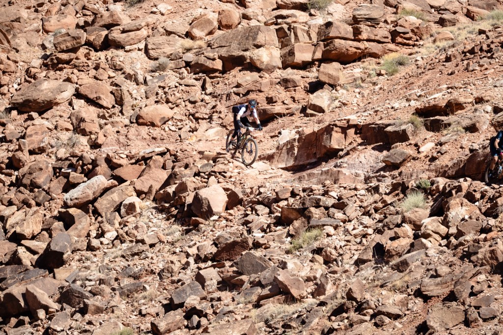 The course started on a gravel road and had a steep climb right away. My strategy was to attack the climb and get to the single track before just riding at my own pace the rest of the leg. That is exactly what I did; 9 and a half minutes later, I was at the top of the climb with an average power of 286W. We descended down the other side and entered the long sand pit before pitching up again and into the single track in 21 minutes at 270W. Now I just wanted to pace myself, as although not specifically steep, the climb to the top of the course was an hour and twenty minutes from the start. The climb had everything from gravel, sand, rocky single track, and fast dirt single track. The problem for me came towards the end as you climb some of that bumpy rock like the day before. It really took a toll on my back, hips, and even my arms. My power dropped significantly, and it was really hard to get fuel in with the constant rocky, bouncy climb.
